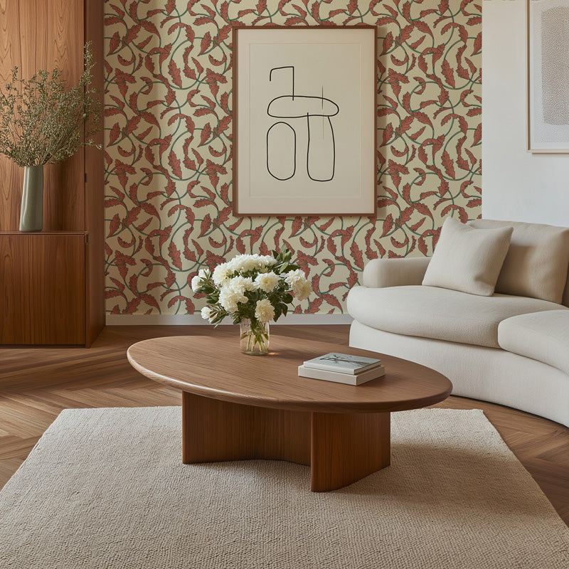 This wallpaper features a dynamic arrangement of curling vines and stylised leaf shapes that create a sense of continuous motion across the wall. The detailed illustration and warm colour tones give the design depth while maintaining a balanced and decorative composition.