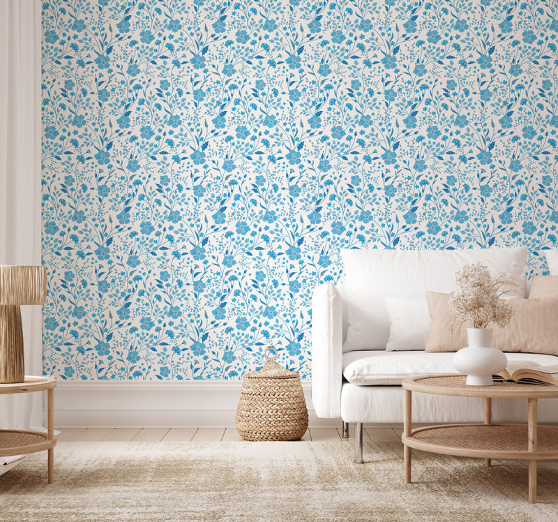 Azure Meadow is a timeless floral wallpaper inspired by classic botanical illustrations, reimagined in a fresh palette of layered blues. The design feels calm and uplifting, offering a refined decorative rhythm that brings elegance and clarity into a space without overwhelming it.