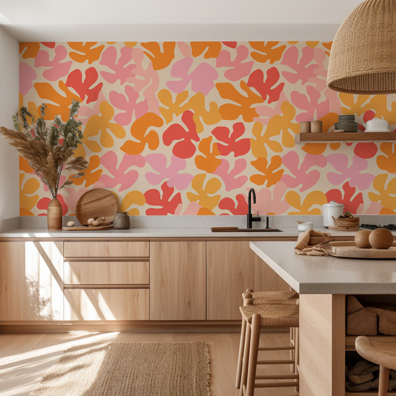 The pattern features rounded, petal-like shapes arranged in an easy, flowing repeat that creates a gentle rhythm across the wall. Peach, coral and warm yellow tones sit on a neutral base, forming a palette that feels sunny and uplifting without becoming overpowering. The organic shapes and softened edges give the wallpaper a hand-drawn quality that adds charm and personality.
