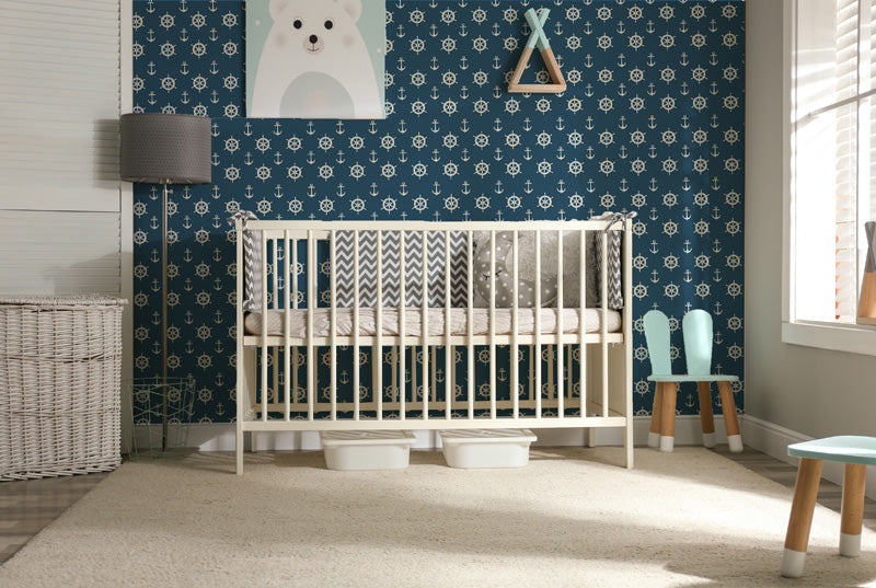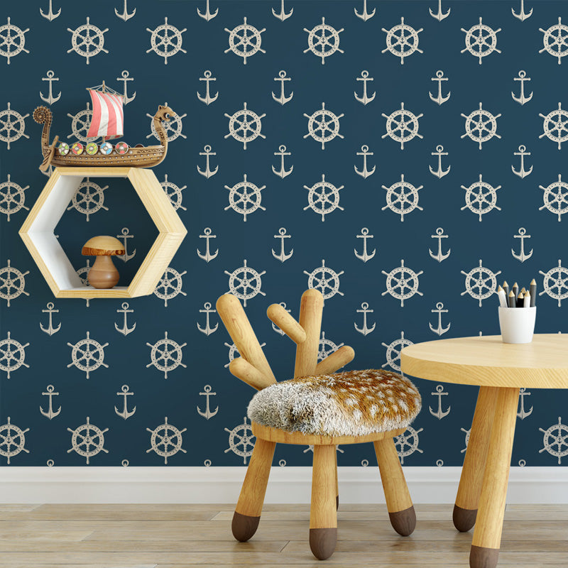 This wallpaper features a repeating nautical design combining anchors and ship wheels arranged in a balanced, graphic layout. The clear motifs and strong contrast give the pattern a structured yet approachable look that feels instantly recognisable and timeless.
