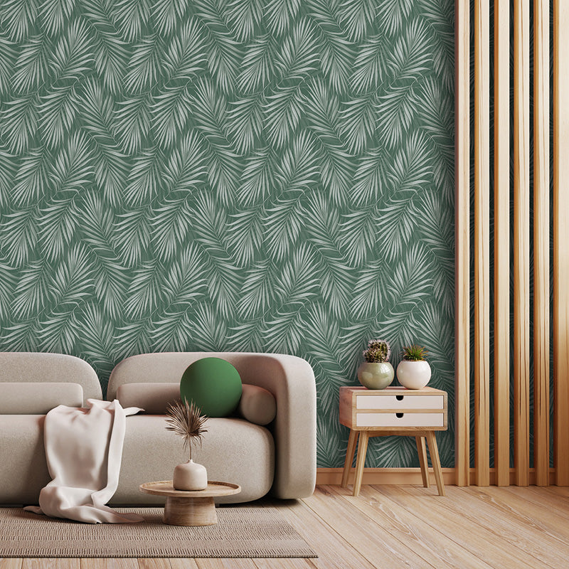 The pattern features elegantly layered palm fronds with fine line detailing and subtle tonal shifts. The overlapping leaves create natural rhythm and flow across the wall, while the balanced colour palette keeps the design light and versatile rather than bold or overpowering. The result is a wallpaper that adds interest without dominating the space.