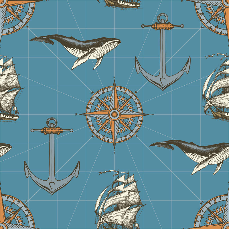 This wallpaper showcases an illustrated nautical map composition combining classic maritime symbols such as sailing ships, anchors, whales and compass roses arranged over a chart-inspired grid. The hand-drawn style and balanced layout create a visually engaging pattern that feels both decorative and story-driven.