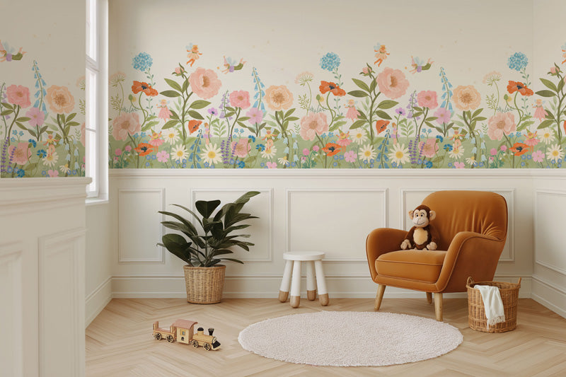 Large roses, daisies, poppies, bluebells and wildflowers grow from a grassy base, illustrated with charming texture and warmth. Between the blooms, a cast of tiny fairies dances, explores and sparkles, adding movement and wonder to the mural. The generous white space above keeps the artwork feeling light and airy, making the room appear more spacious while letting the floral scene remain the hero.