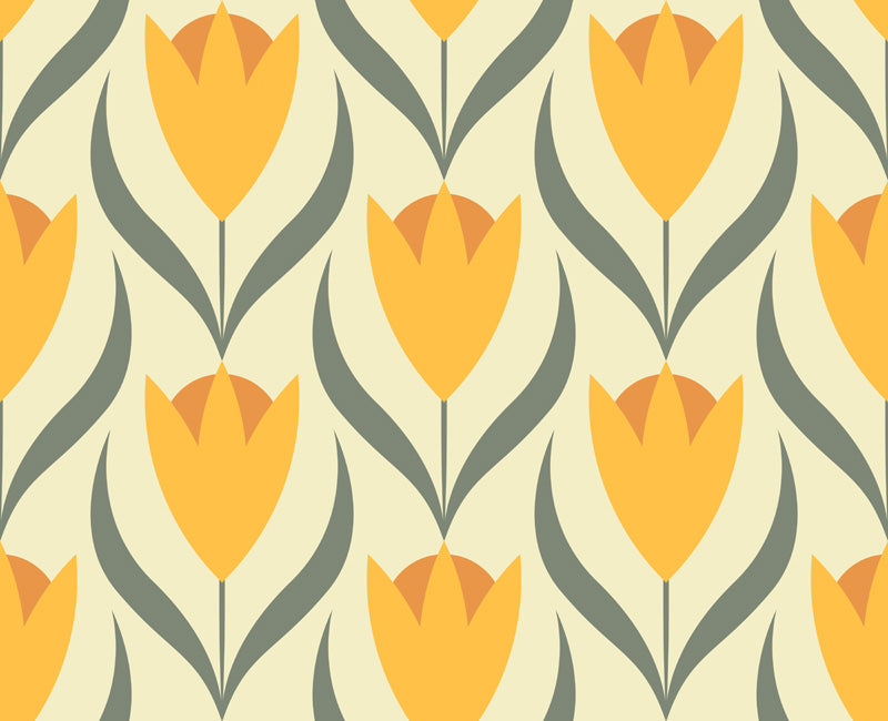 Golden Tulip is a modern Scandinavian floral wallpaper inspired by simple botanical forms and mid-century Nordic design. Stylised tulip shapes rise vertically across the wall, creating a calm, structured rhythm that feels both timeless and contemporary.