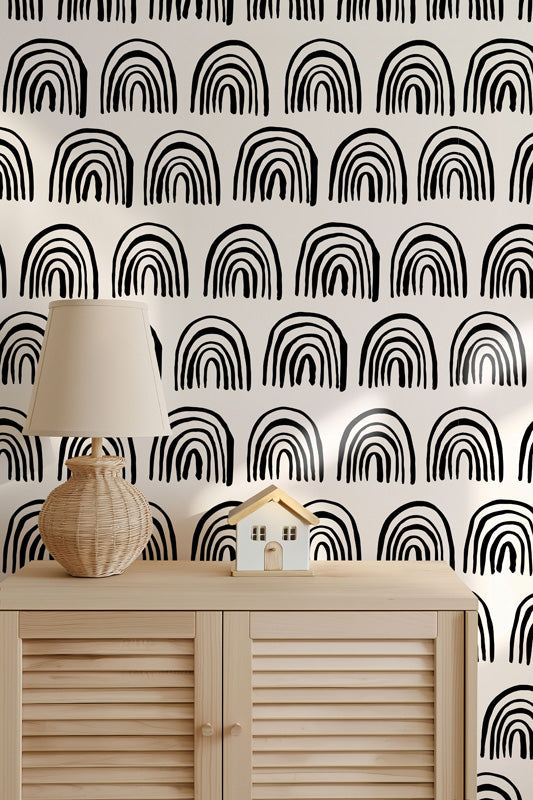 Each rainbow shows subtle variations in spacing and line thickness, enhancing the hand-made quality that gives the design its warmth. The repeating layout provides visual rhythm without feeling rigid, creating an inviting backdrop that works beautifully in both playful and minimalist settings. Whether styled in soft neutrals or striking monochrome, the pattern remains approachable and modern.