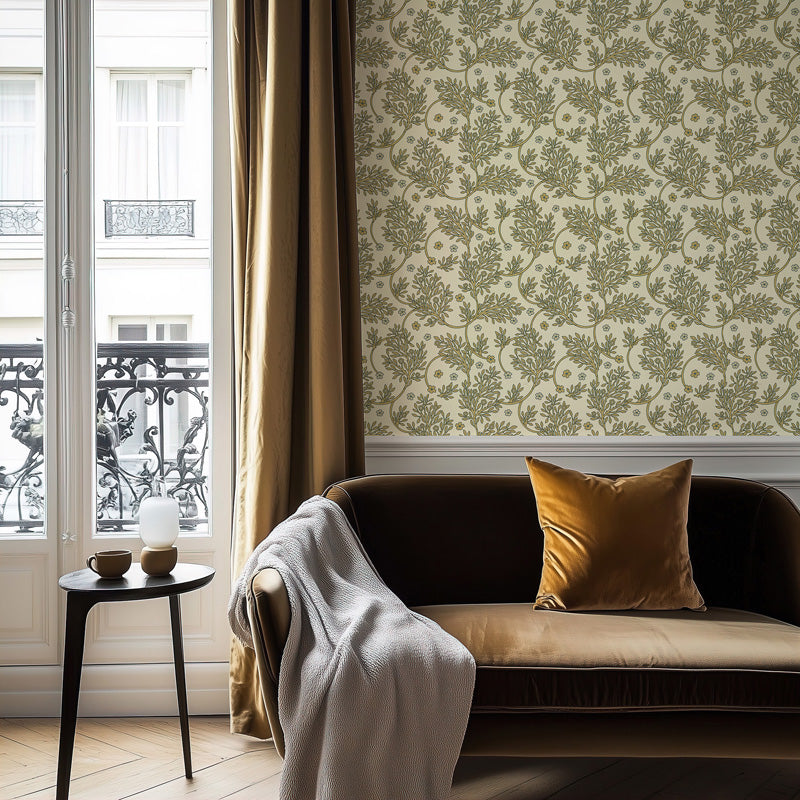 The overall mood is elegant and inviting, making this wallpaper well suited to living rooms, bedrooms and dining spaces, as well as boutique-style commercial interiors. Its ornamental botanical style adds character without overwhelming the space, allowing it to work beautifully as a full-room application or as a decorative feature wall.