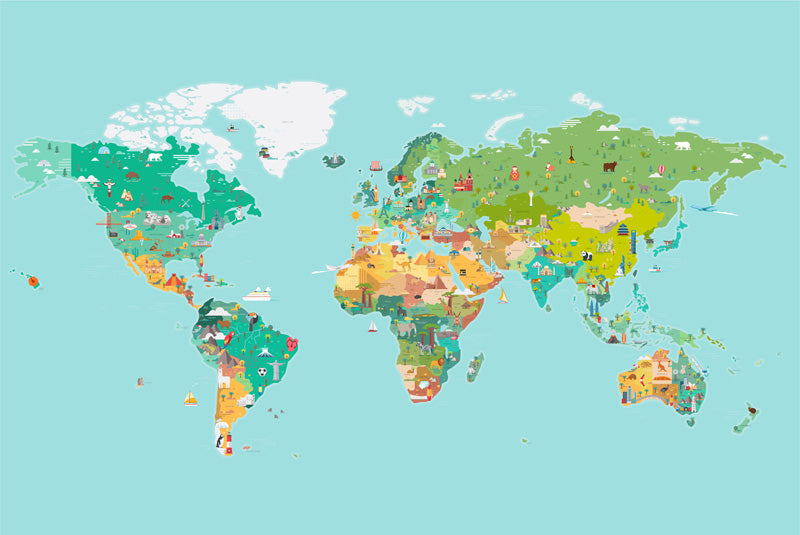Illustrated World Map Mural is designed to spark curiosity, imagination and learning through a bright, friendly interpretation of the world. Each continent is brought to life with charming illustrations representing landmarks, animals, culture and landscapes, making the map both decorative and engaging.