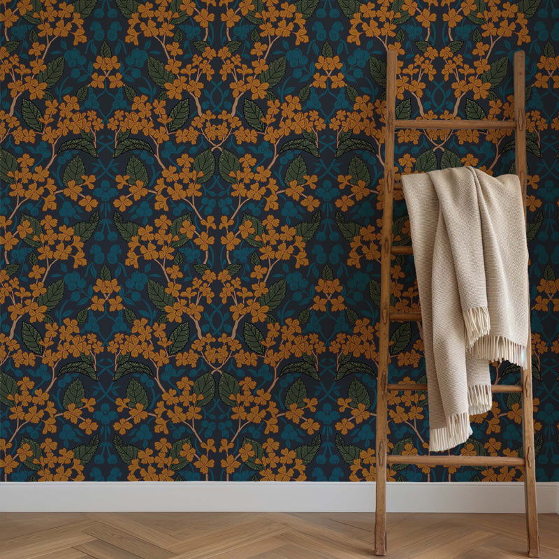 Intricate floral clusters, leafy branches and small berry details repeat across the surface in a carefully structured layout. The pattern feels rhythmic and considered, with contrasting elements working together to create movement without visual overload. The result is a decorative wallpaper that adds richness while remaining harmonious within a space.