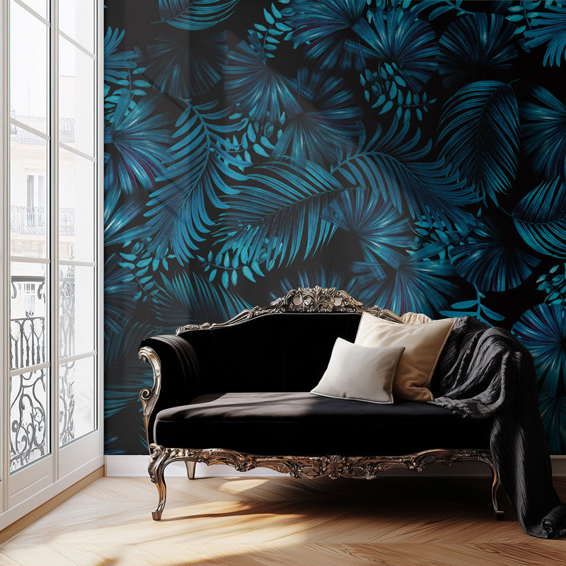 This wallpaper features an immersive composition of overlapping palm fronds illustrated in deep blue tones against a dark base. The layered foliage creates movement and dimension, with subtle highlights that give the design a sense of depth and visual intensity.