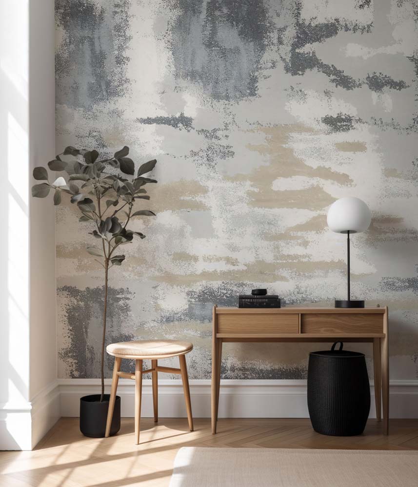 A palette of cool greys, warm beige and off-white blends into one another, forming an abstract composition with a subtly textured look. The diffused shapes create depth while keeping the overall feel light and understated, making it a versatile wallpaper for both minimalist and softly styled spaces. Its painterly effect helps anchor a room with quiet sophistication.