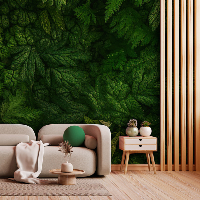 The pattern features dense layers of leafy forms with intricate surface detail, mimicking the look of moss, undergrowth and woodland foliage. Subtle variations in green tones add richness and dimension, allowing the wallpaper to feel immersive without relying on strong contrast. The overall effect is soft, organic and visually soothing.