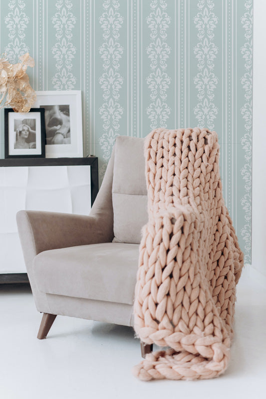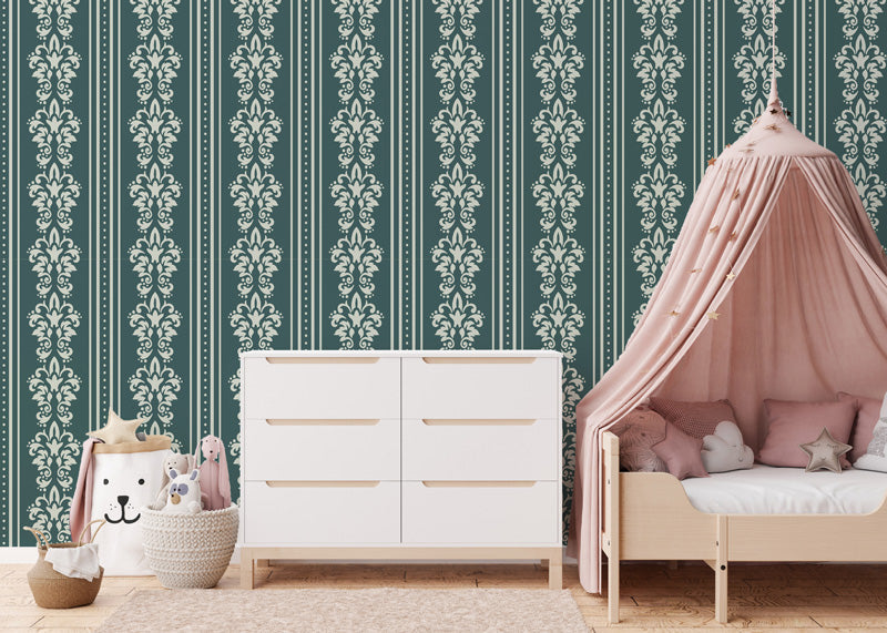 The design features detailed damask motifs arranged in structured stripes, softened by subtle line work and gentle spacing. The contrast between the ornamental pattern and the vertical bands adds depth without overwhelming the room, allowing the wallpaper to feel elegant, composed and visually calming across different colour variations.