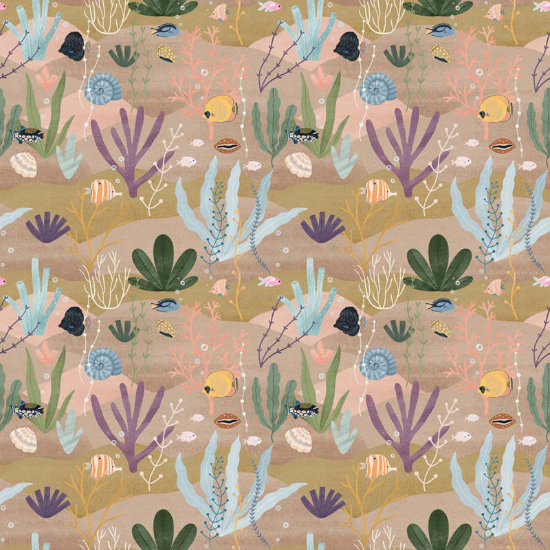 Each motif is hand-drawn with gentle shading and layered detail, giving the pattern a warm, tactile feel. The colour palette shifts between sandy browns, ocean greens, muted blues and coral pinks, allowing the design to work well in both coastal-inspired rooms and softly neutral interiors. The repeating layout creates a natural sense of rhythm, making it perfect for full-room coverage or a charming feature wall.