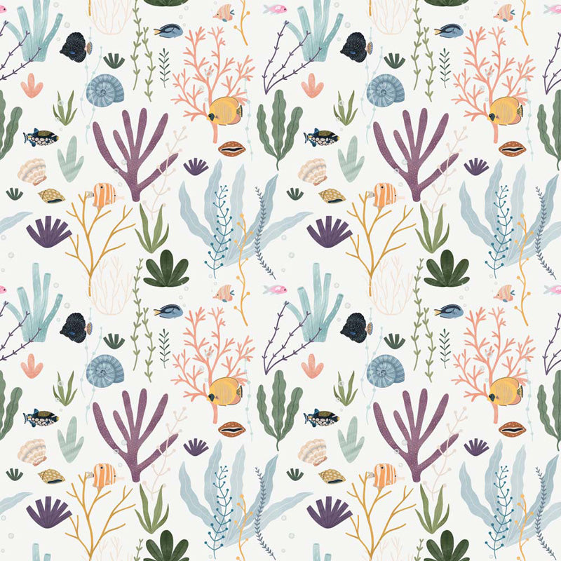 Seabed Treasures brings the vibrancy of an underwater landscape to life through a beautifully illustrated repeating pattern. This design blends whimsical marine elements with soft, textured tones, creating a lively yet calming backdrop for children’s spaces. Coral fans, seashells, seaweed clusters and colourful fish all float harmoniously across the wallpaper, offering plenty of visual interest without overwhelming the room.
