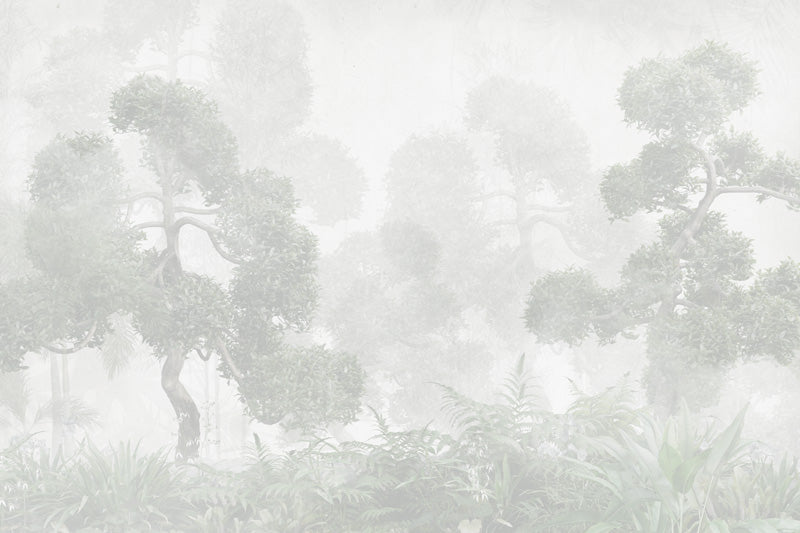 The artwork features gently silhouetted trees and low botanical forms emerging through a hazy, textured background. Soft grey tones and delicate transitions create a sense of depth while maintaining a light, airy feel. The muted palette allows the mural to blend seamlessly into its surroundings, making it both versatile and timeless.