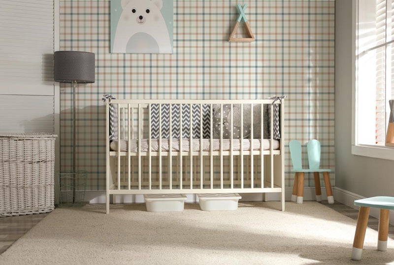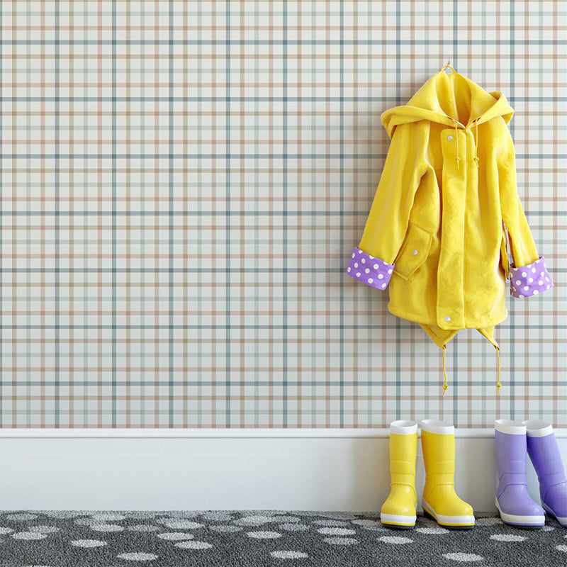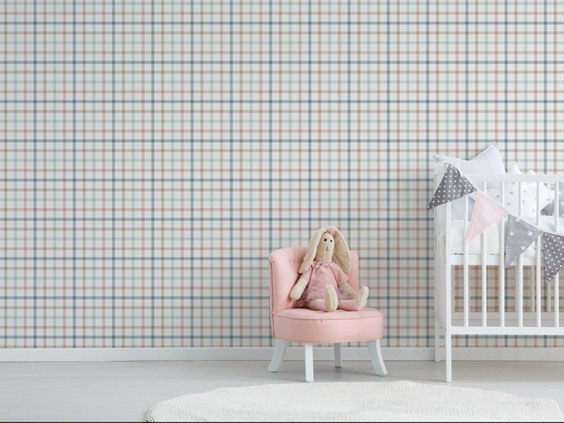 The pattern features finely layered horizontal and vertical lines that intersect to form a gentle plaid effect. Subtle variations in tone add depth and softness, preventing the design from feeling rigid or overpowering. The result is a wallpaper that feels warm, approachable and visually soothing, while still offering enough detail to enrich the room.
