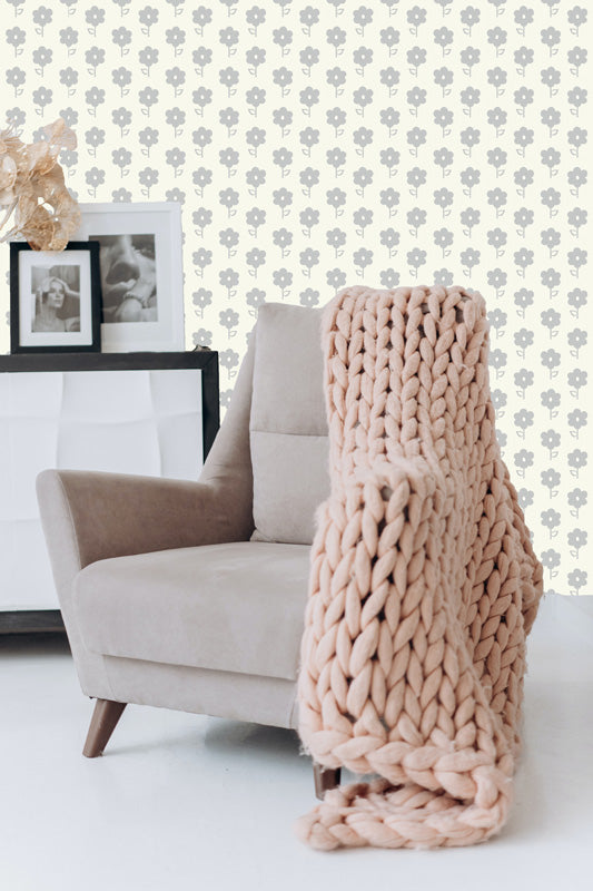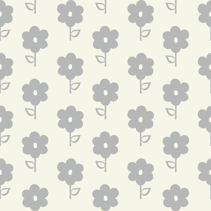 The pattern features stylised floral motifs arranged in a neat, repeating layout. The rounded flower forms and subtle detailing give the design a gentle, almost hand-drawn character, while the soft grey tones create a neutral backdrop that works effortlessly with a wide range of colour palettes.