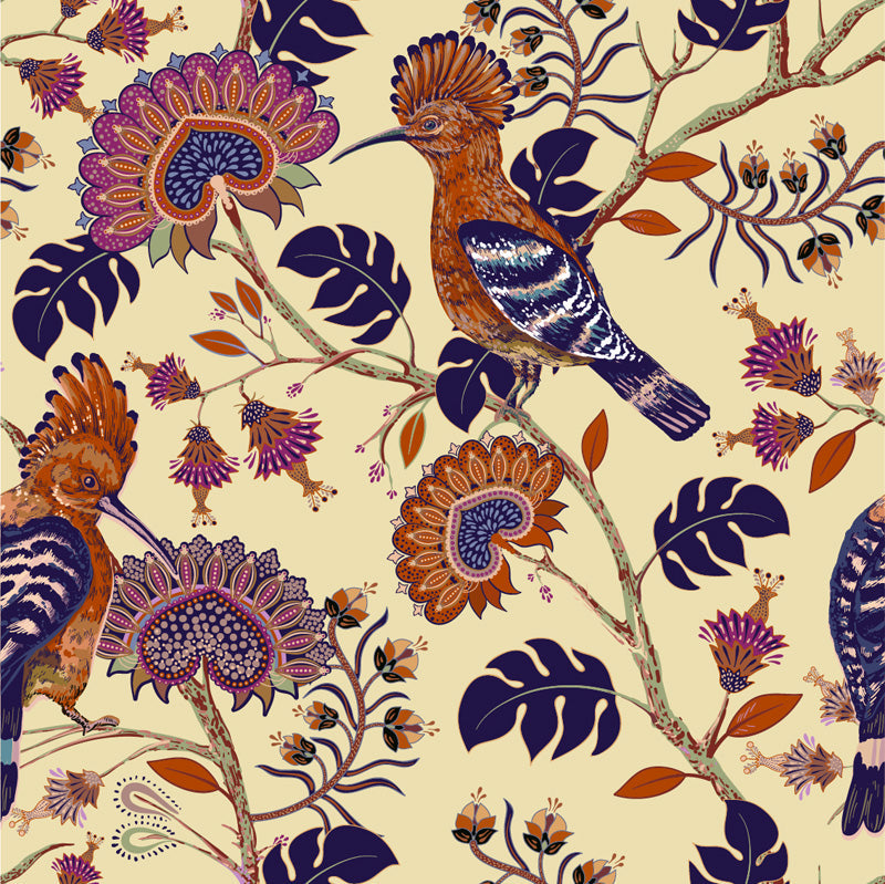 Intricate blooms, branching stems and bold leaf silhouettes create movement throughout the design, while the feathered motifs add a focal-point quality without overpowering the space. The palette is designed to work across colour variations, pairing inky, moody tones with warm spice notes and soft neutrals that keep the overall feel balanced.