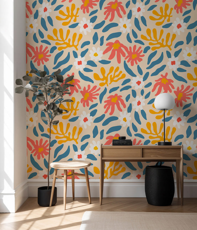 Sunny Petals is an abstract floral wallpaper designed to fill a room with light, warmth and an easygoing sense of joy. The pattern feels relaxed and contemporary, drawing inspiration from simplified floral forms and playful, hand-shaped motifs that give the design a distinctly artistic character.