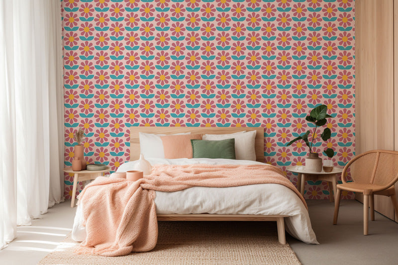Sunny Petals is a joyful retro floral wallpaper inspired by mid-century design, vintage textiles and playful Scandinavian folk patterns. The design features oversized daisy-style blooms with rounded pink petals, vibrant yellow centres and contrasting teal leaves, arranged in a neat, repeating layout that feels both structured and cheerful.
