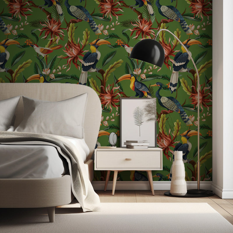 This exotic bird wallpaper is ideal for feature walls in living rooms, dining areas, creative studios or boutique commercial spaces. It can also add character to bedrooms and entryways, pairing beautifully with timber tones, cane furniture, leafy indoor plants and warm textile accents.