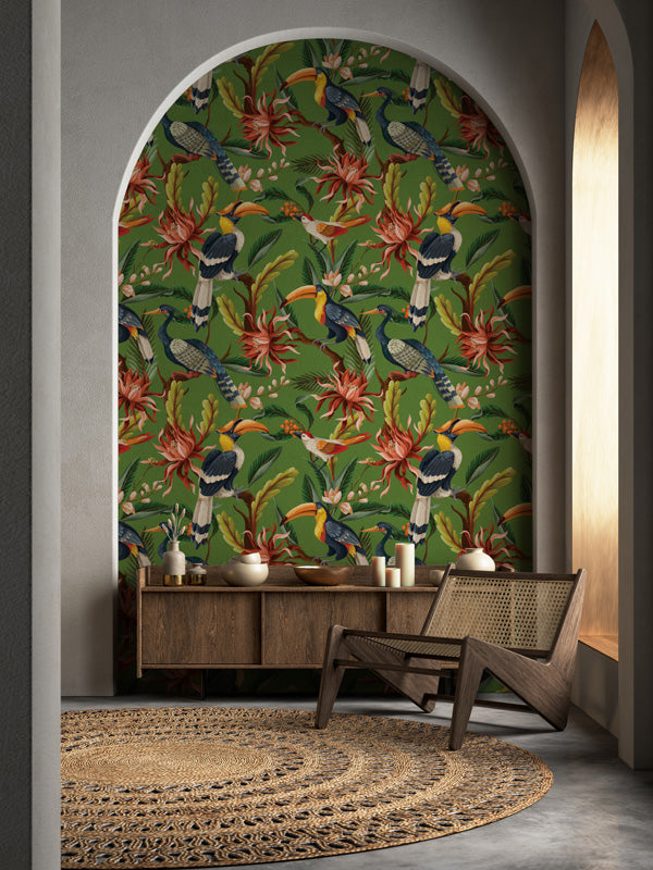 Whether used boldly across an entire room or as a standout feature wall, Tropical Hornbill Garden transforms your interior with lush tropical energy and artistic depth.