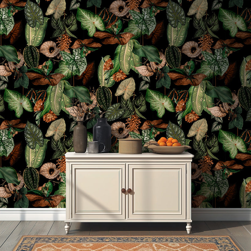 This wallpaper showcases an opulent composition of layered foliage, featuring a mix of broad leaves, intricate veins and varied botanical forms arranged over a dark base. The detailed illustration style creates depth and contrast, allowing each element to stand out while forming a cohesive, immersive pattern.