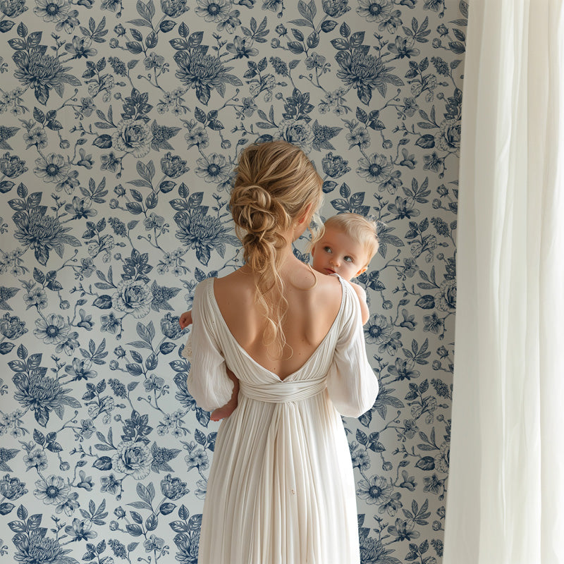 This design showcases a flowing arrangement of illustrated flowers, leaves and branches, rendered in a classic toile style with fine linework and gentle movement. The composition feels balanced and decorative, allowing the botanical elements to repeat naturally across the wall while maintaining an airy and cohesive look.