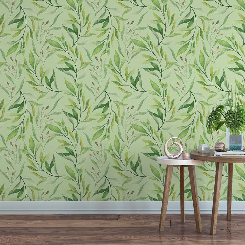 This wallpaper showcases a repeating botanical design with gently arching branches and elongated leaves, illustrated in a soft watercolour style. The organic shapes create a natural rhythm across the wall, offering a sense of movement while remaining visually balanced and refined.